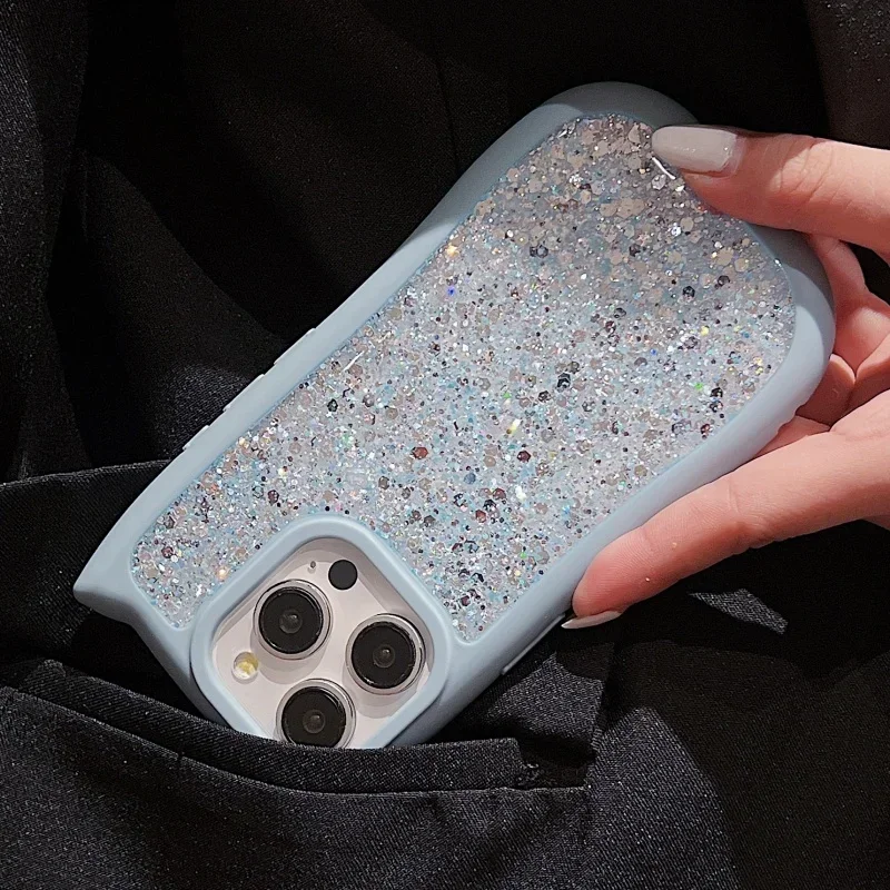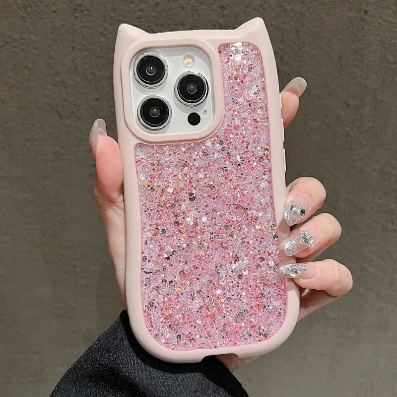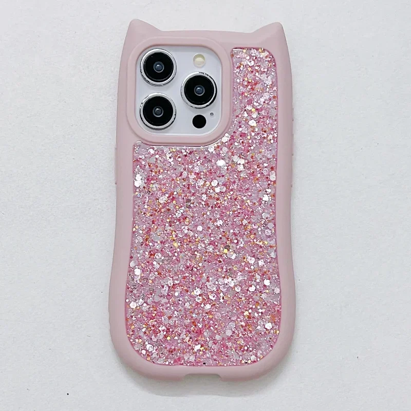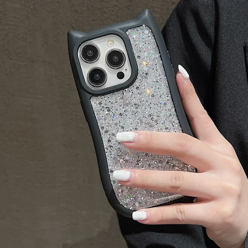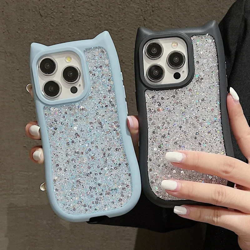 Cute Cartoon 3D Cat Ear Glitter Sequins Soft Silicone Phone Case For iPhone 16 15 14 Plus 11 12 13 Pro Max TPU Shockproof Cover